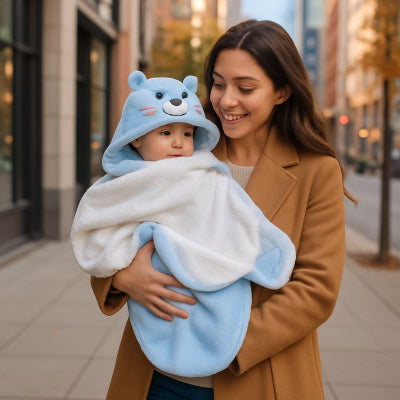 Notre Couverture Nomade Bébé Chaleureuse avec son motif ourson bleu et ses attaches velcro est l'exemple parfait de cette polyvalence.